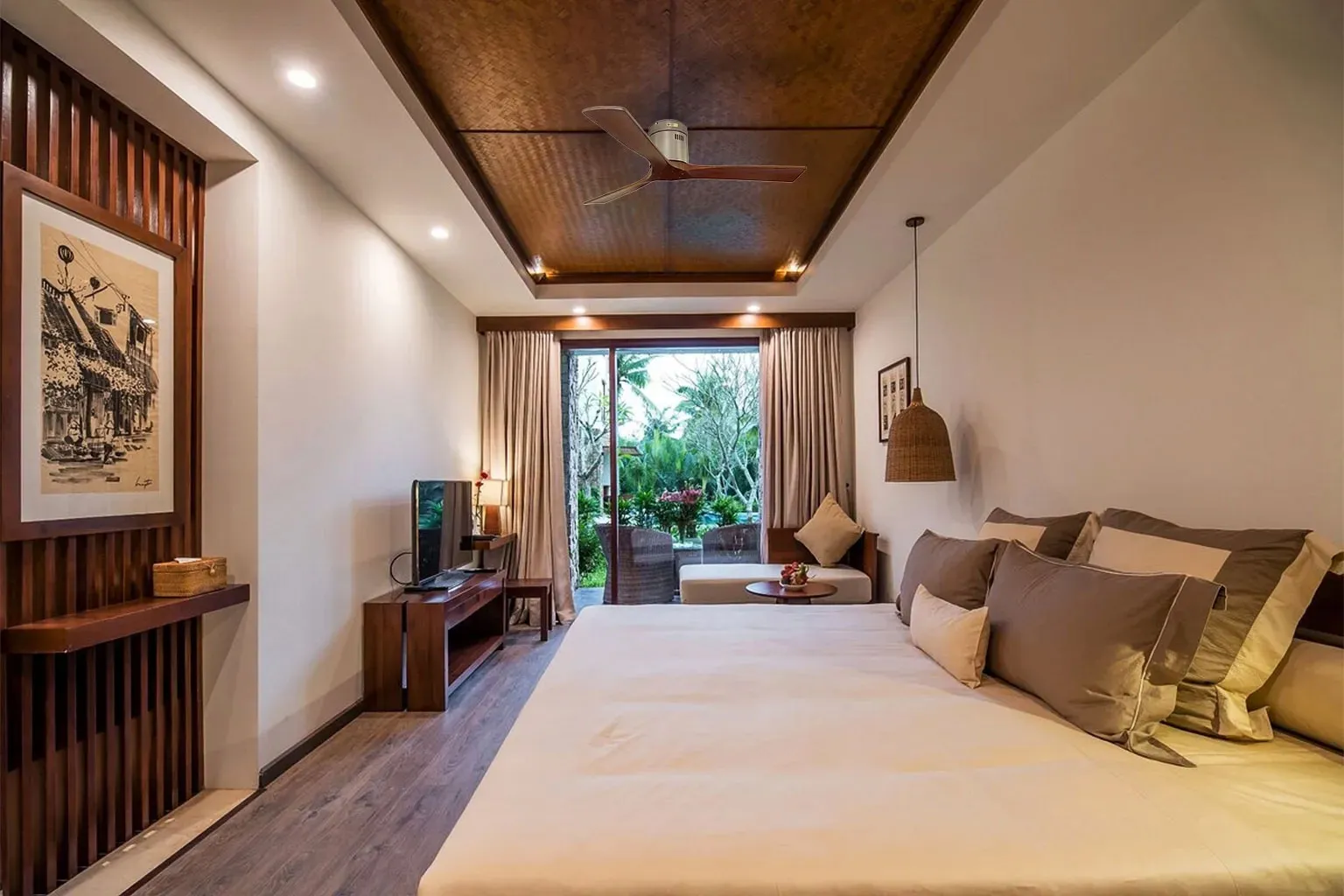 Các phòng tại Hoi An Eco Lodge & Spa được thiết kế đặc trưng là nội thất gỗ tếch thủ công và sàn gỗ đánh bóng kết hợp với tường trắng cùng ánh đèn sáng mờ ảo là sự kết hợp hoàn hảo giữa hiện đại và sinh thái. Quạt trần đèn JC0017 tại TAE OH chính là sự lựa chọn phù hợp cho không gian nội thất này.