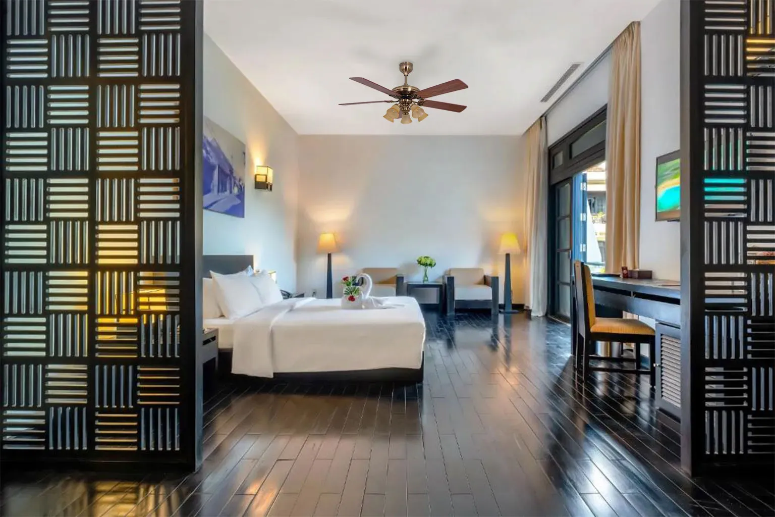 Sân vườn của Hoi An Historic Hotel được thiết kế theo tiêu chí “Bông sen xanh” với nhiều cây xanh bao phủ xung quanh khách sạn. Có lẽ cũng vì thế mà mẫu thiết kế quạt trần JC503 tại TAE OH lại hợp với không gian nội thất nơi đây đến vậy.